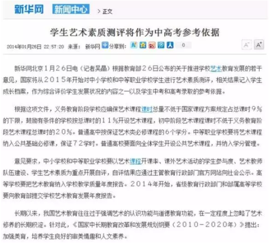 由此可见,教育部印发的《中小学生艺术素质测评办法》等三个文件(教体艺〔2015〕5号)明确指出,将艺术素质测评纳入学生综合素质评价体系以及教育现代化和教育质量评估体系,并将测评结果记入学生成长档案,作为综合评价学生发展状况的内容之一,以及学生中考和高考录取的参考依据。